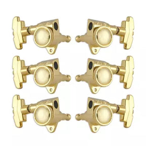 La série 509 utilise le célèbre système Rotomatic® avec un mécanisme à vis moletée qui bloque la corde en place, permettant un changement de corde rapide. Pour l'utiliser, insérez la corde dans le trou du support, enroulez-la une fois, puis bloquez-la en serrant la vis moletée. Le bouton à trois positions confère à ces mécaniques un aspect distinctif et les différencie des autres modèles Rotomatic®.