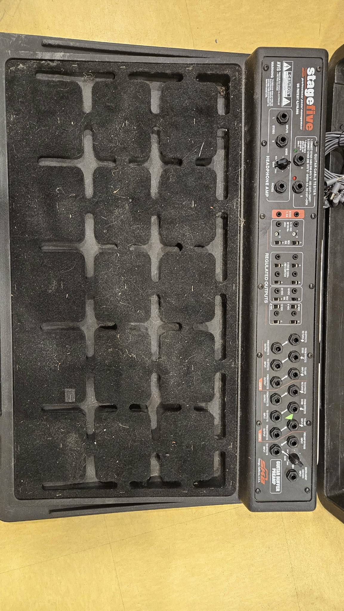 Deux prises jack 9 V CA de 1,3 A pour alimenter les pédales Digitech, Line 6, etc. ; deux prises CC variables permettant une tension de 4 à 12 volts (simulant une batterie presque déchargée) ; quatre prises CC standard de 9 V pour Boss, Electro-Harmonix, etc. ; une prise CC de 18 V pour MXR, EVH Flanger, etc. ; une prise CC de 24 V pour les pédales boutique et vintage ; et deux prises CC de 9/12 V pour alimenter d'autres pédales boutique et vintage. Toutes les prises CC sont équipées d'un inverseur de polarité, ce qui permet d'utiliser le pédalier professionnel SKB-PS-55 Stagefive sans problème de polarité centrale. Chaque sortie CC a un courant nominal de 100 mA.