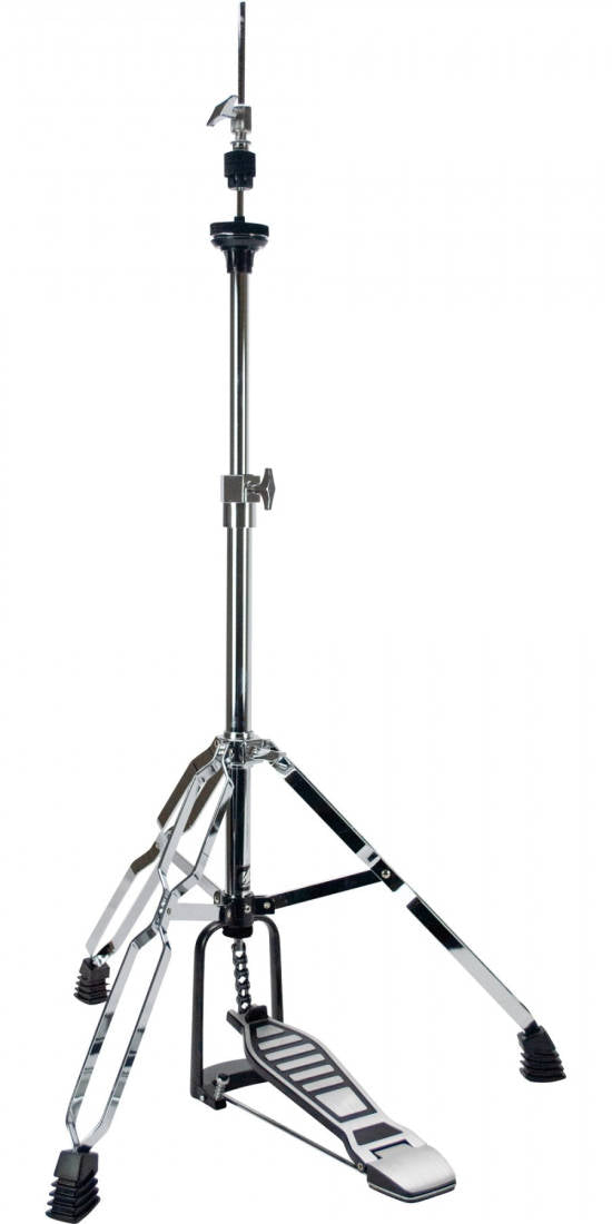 Pied de charleston HH600D à double embase. Il est doté d'un tendeur frontal, d'une embase en acier massif, de pieds à double embase, de verrous de mémoire et de larges vis papillon pour un réglage aisé. Un mécanisme à came à chaîne assure un fonctionnement fluide, tandis que le système de coupelle et d'embrayage robuste facilite la fixation de la cymbale et le réglage de l'angle.